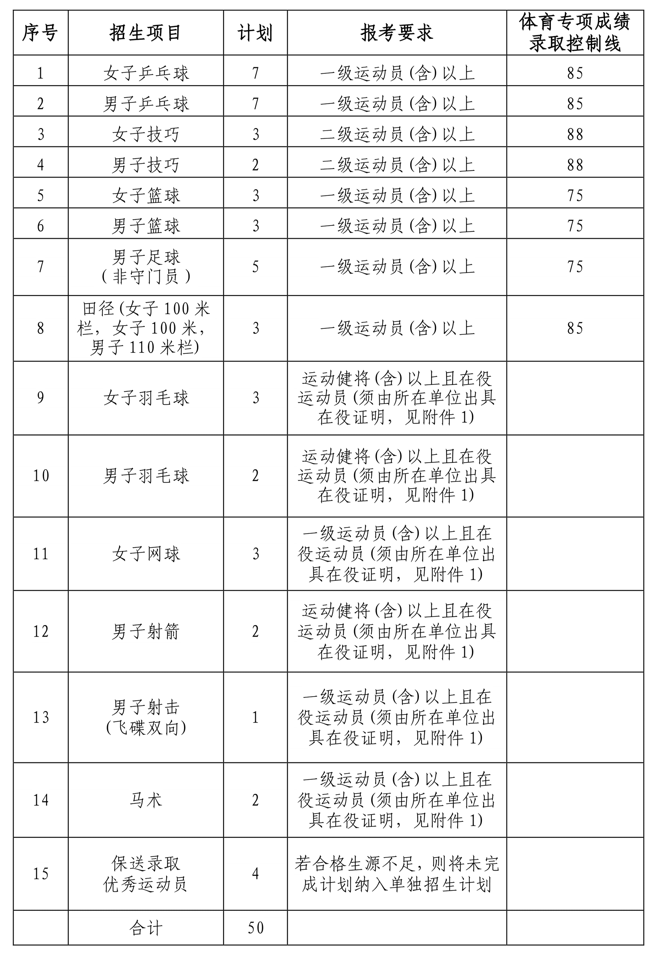 2.体育专项成绩录取控制线:见表1。表1中未作规定的项目,体育专项成绩不低于40分。